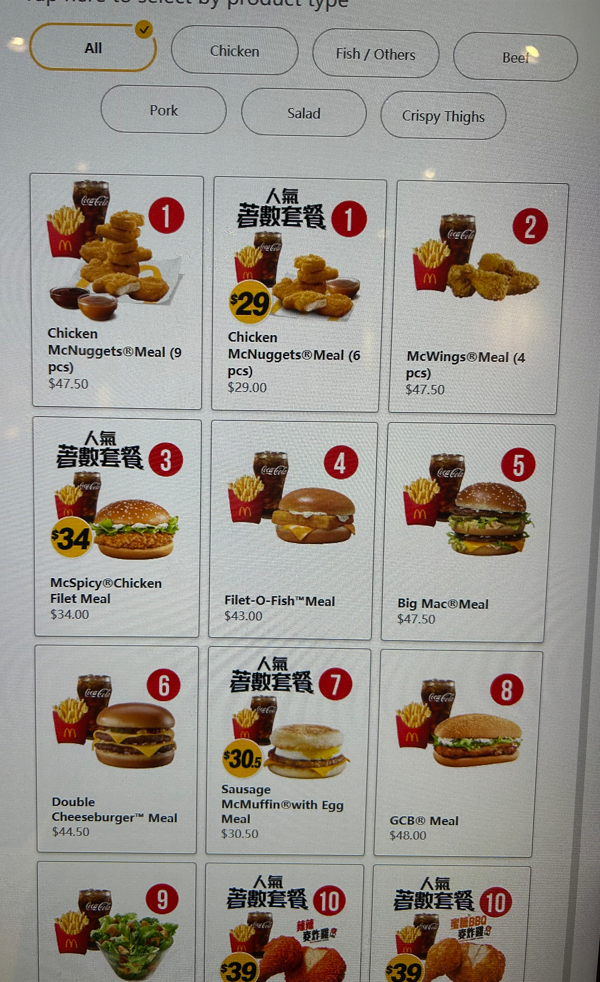 香港のマクドナルドでは、ほぼすべての店舗でタッチパネル注文が主流です。