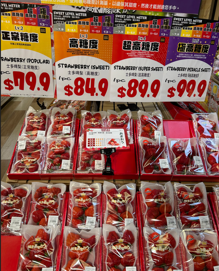 • いちご(糖度表示つき):HK$79.9〜99.9(約¥1,622〜2,028)