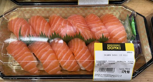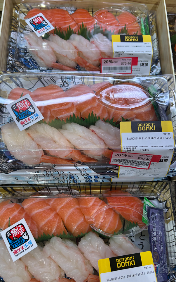 寿司は日本より高いですが、たまに食べるには十分の品質と価格感。割引タイミングもあるので、赤い割引シールを見つけたら狙い目です。