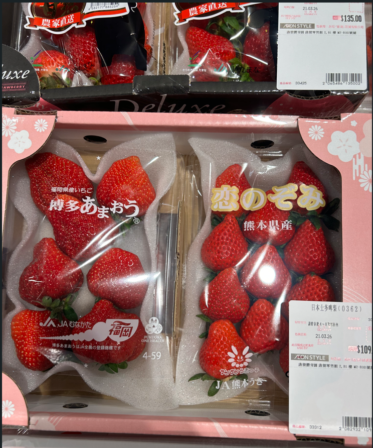 📸 日本産いちご(例):HKD109(約2,215円)HKD135(約2,743円)