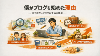 自己紹介 海外駐在ミニマリストがブログを始めた理由|発信で得られた気づきとメリット 海外駐在とミニマル生活という環境の中で、なぜブログを始めたのかを率直に紹介。キラキラしない駐在のリアル、ブログを選んだ理由、記録として残したい思い、副業はストック型が向いていると気づいた背景をまとめました。 2026.02.22 自己紹介